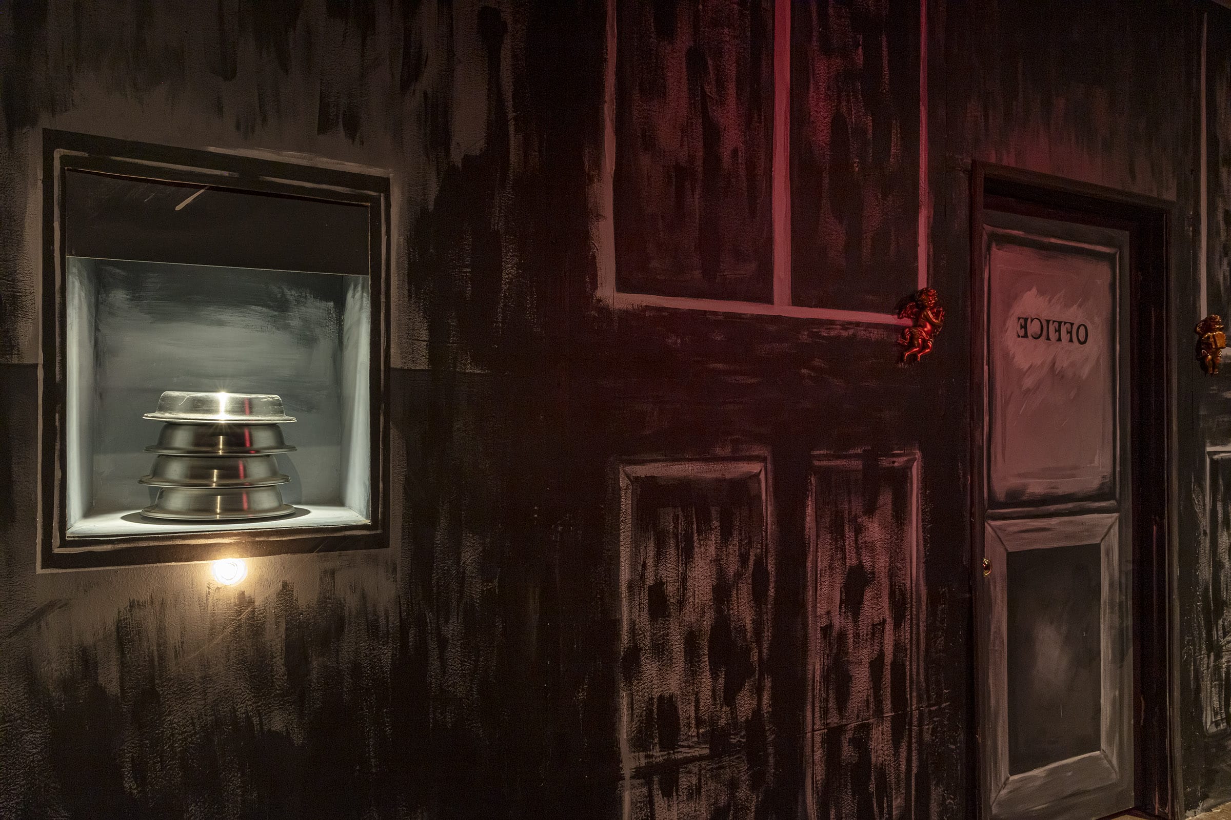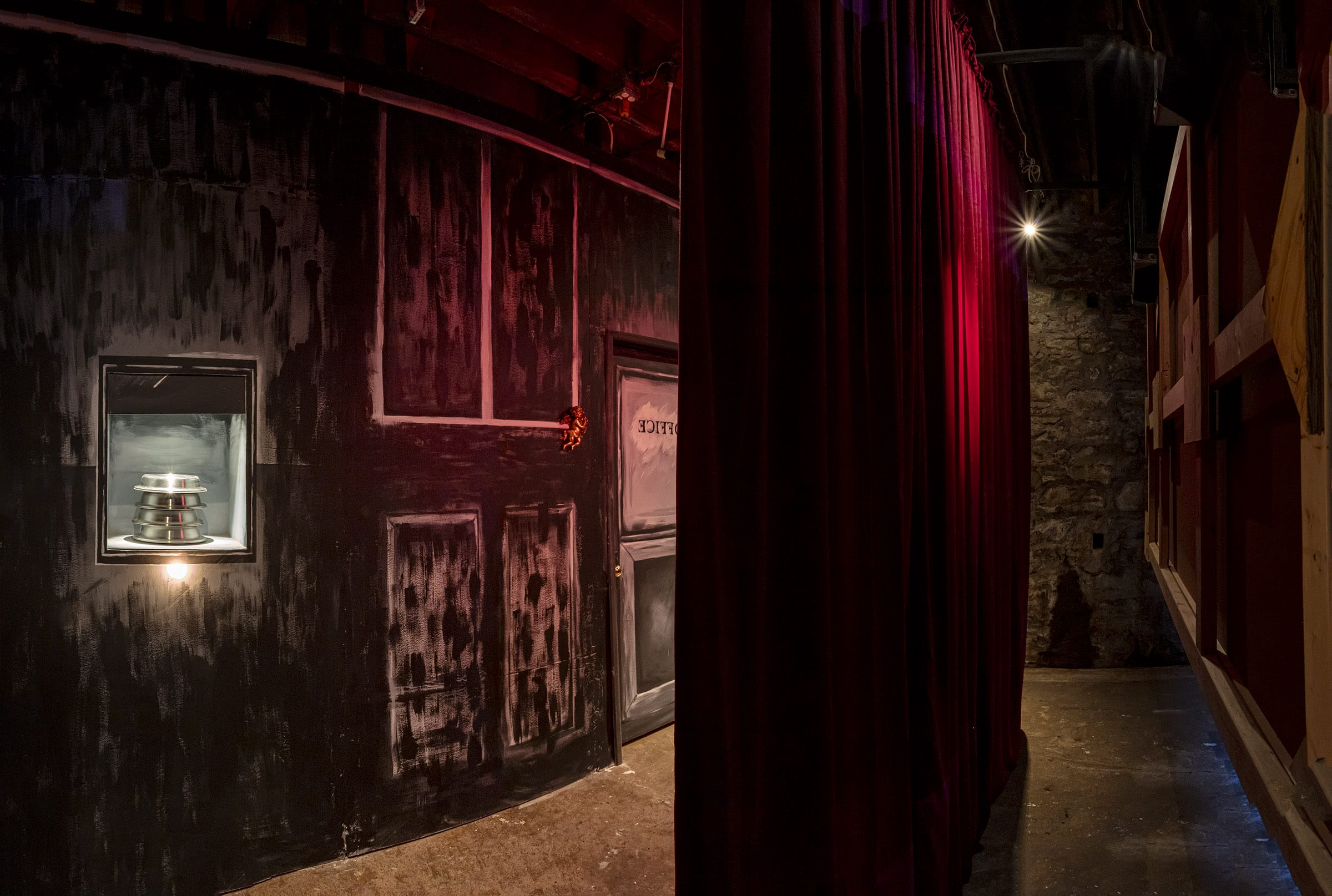 Materials: Two-channel video, film set In the summer of 2024, Ting Tong Chang spent the better part of a week exploring Pittsburgh, during which time he learned of the pivotal role the region played in the history of organized labor. He was particularly struck by the 1892 Homestead Strike — a violent confrontation between workers and Henry Clay Frick’s Pinkerton agents – and the extreme power imbalances it highlighted. Drawing inspiration from these events, as well as from the Mattress Factory’s own layered history of industrial and cultural production, the Taiwanese-born artist worked alongside local filmmakers Alex Abrahams and Benny Shaffer to create a story that would weave these threads together. The resulting work is a murder mystery film set in a fictional macaroni factory, where the factory owner is found dead and each character carries their own potential motives and suspicions. This film noir–inspired work began as a three-act play. Here it becomes juxtaposed with a documentary style “making of” film. It is both a film and a film about the making of that film. This cinematic device is further complicated by the casting of museum staff as the film’s actors. What emerges is not just a behind-the-scenes look into the creative process but an intimate portrait of daily museum life. Alongside cast rehearsals and set building, we see staff using the copy machine, greeting visitors, and cracking jokes at a morning meeting. The result is a twisting metanarrative that dissolves the boundaries between art and labor, performance and production. Through its structure and story, The Hidden Shift invites viewers to grapple with complex questions surrounding capitalism, the meaning of work, and the precarity of the so-called ‘creative class.’ This blending of reality and fiction extends beyond the screen, unfolding further within the exhibition space. Here, visitors encounter remnants of the film set – hand painted backdrops, leftover props, and dramatic lighting. By positioning the audience within the physical traces of the film’s production, Chang creates a bodily experience that unsettles our sense of what is real and what is constructed. We find ourselves unwittingly stepping onto a stage that slowly reveals itself. At the climax of the film, the two juxtaposed narratives begin collapsing into each other. Staff are shown in costume walking through the museum. Fictional characters break the fourth wall. A boom mic operator slips into frame. This self-awareness and subtle humor is common in Chang’s work, where drama and satire merge, offering a lens to help us understand our complex past as we confront an uncertain future. Cast The Anarchist: The Capitalist: The Detective: The Secretary: The Union Leader: The Factory Workers: Crew Musical performance by Pittsburgh Labor Choir members: Text by Danny Bracken Ting Tong Chang (b.1982, Taipei) is an artist who lives and works in Taipei, Taiwan and Santiago de Compostela, Spain. Starting his early career as a street artist, Bbrother, Chang's politically charged works had repeatedly become the focus of media attention and public debate. After completing his MFA at Goldsmiths, University of London in 2011, Chang transitioned towards contemporary art. His satirical gaze leaves no aspect of society untouched. Revelling in the absurd and illogical, he makes a mockery of socio-political subjects ranging from the social and ecological effects of consumerism to the functioning of the art world itself. Working across the distinct practices of immersive installation, video and theatre, his transgressive practice co-opts science, technology and history to dissect the world around him. Chang has exhibited internationally. He held solo exhibitions at the Museum of NTUE(TW) and Taipei Fine Arts Museum(TW) and has participated in group shows and commissioned projects in Guangzhou Triennial(CN), Taipei Biennial(TW), Yamaguchi Center for Arts and Media(JP), Compton Verney Art Gallery(UK) and Wellcome Trust(UK). Chang’s major awards include the Taishin Arts Award(TW), Taipei Art Award(TW), Art Central RISE Award(HK), VIA Arts Prize(UK), and Gilbert Bayes Award(UK). His works can be found in the Taipei Fine Arts Museum(TW), Hong Foundation(TW), Aura Contemporary Art Foundation(JP), Hertzog Da Silva Collection(ES) and private collections in Europe and Asia. 張碩尹1982年出生於台北,現工作與居住於台灣台北與西班牙聖地亞哥德孔波斯特拉。張碩尹早期以塗鴉藝術家Bbrother為名創作,其充滿政治意識的模板大量出現在台北街頭,並數度為媒體焦點與話題人物。2011年自倫敦大學金匠學院藝術碩士畢業後,其詼諧反諷的創作語彙擴及社會政治議題、自然生態與當代生活的各種層面,其合作計畫統合科技、科學與歷史等不同知識領域,媒材跨及大型裝置、錄像、與劇場。 他的近期個展於北師美術館、台北市立美術館舉行;並參與台北雙年展(台灣)、廣州三年展(中國)、山口情報藝術中心(日本)、 康普頓弗尼美術館(英國)、惠康基金會(英國)之群展與委託案.近期獲獎包括台新藝術獎(台灣)、台北美術獎(台灣)、Art Central新晉菁英大獎(香港)、伊比利美術獎(英國)、吉爾伯特·貝葉斯獎(英國)。作品受台北市立美術館(台灣)、洪建全基金會(台灣)、アウラ現代藝術振興財団(日本)、赫爾佐格·達席爾瓦基金會(西班牙),與亞洲歐洲私人收藏. This exhibition is made possible by Teiger Foundation.